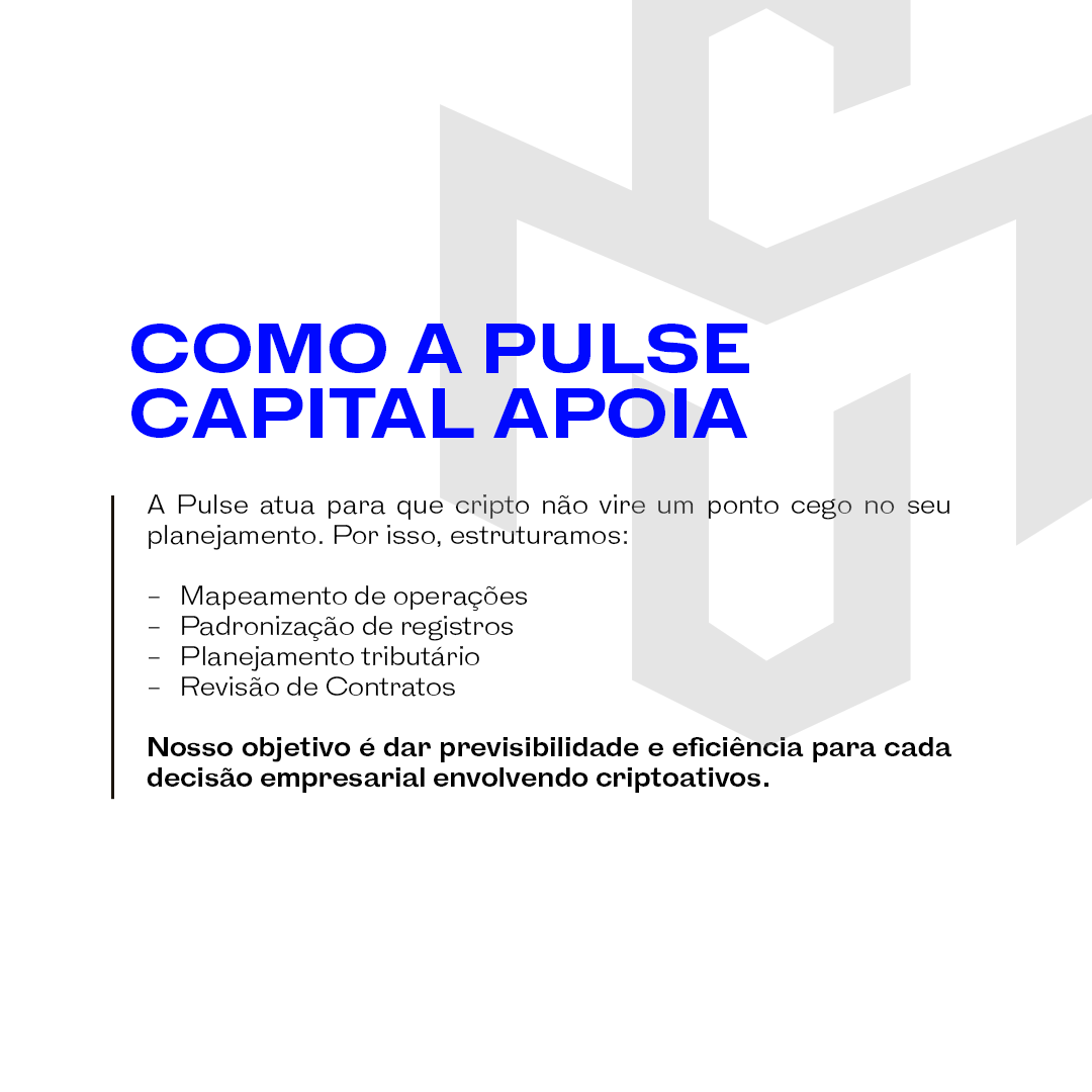 A Pulse Capital atua para antecipar esse movimento. Ajudamos empresas a estruturar o uso de criptoativos com base técnica sólida, integrando planejamento tributário, desenho societário e análise financeira com foco em eficiência e segurança regulatória.