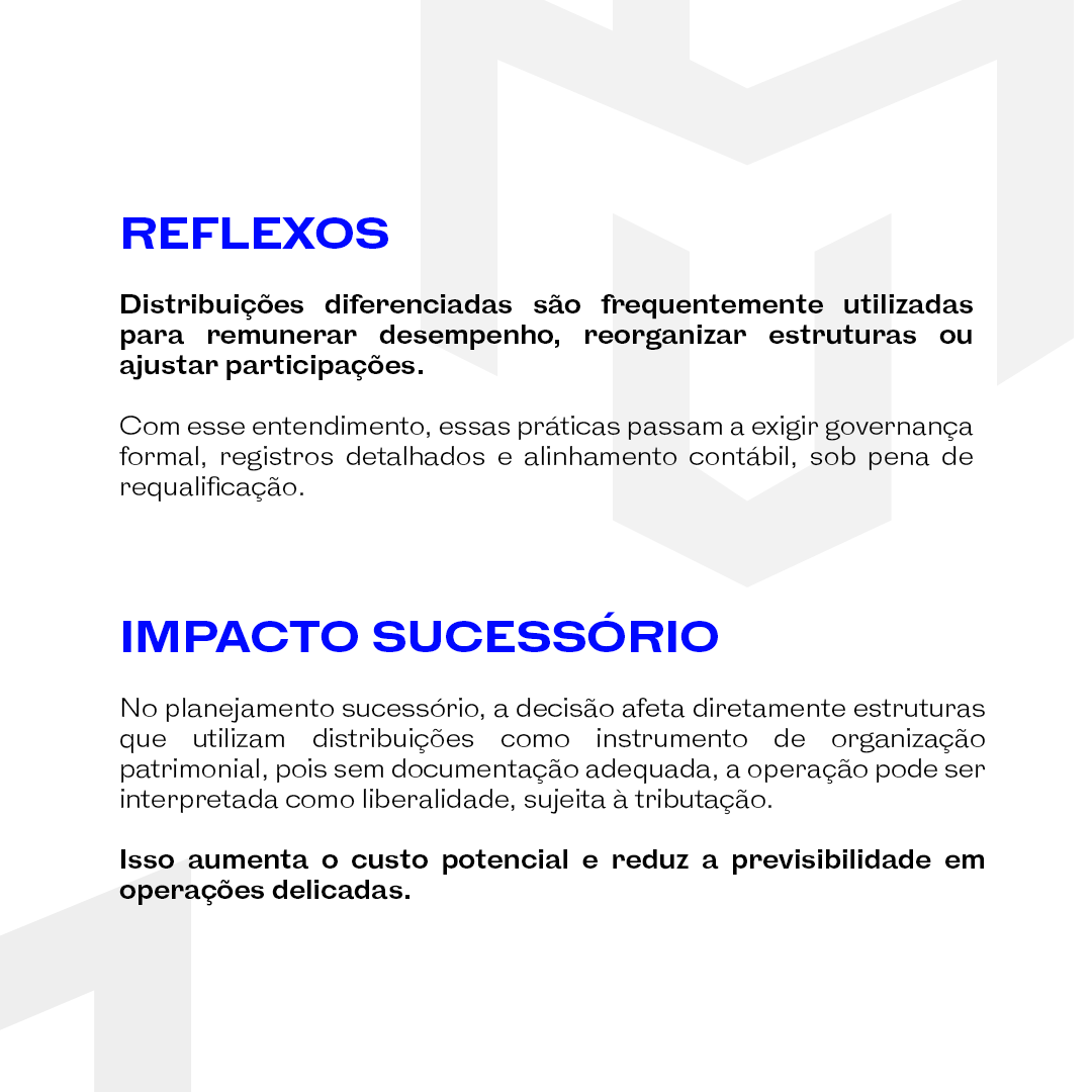 Esse entendimento amplia o risco em planejamentos patrimoniais e sucessórios que utilizam distribuições diferenciadas como ferramenta de organização de ativos ou compensação entre sócios.