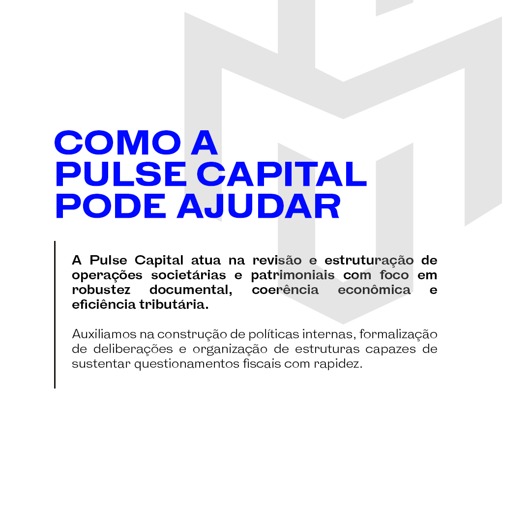 A Pulse Capital assessora empresas e famílias empresárias na construção de estruturas que alinham forma, substância e prova, reduzindo exposição a reinterpretações fiscais.