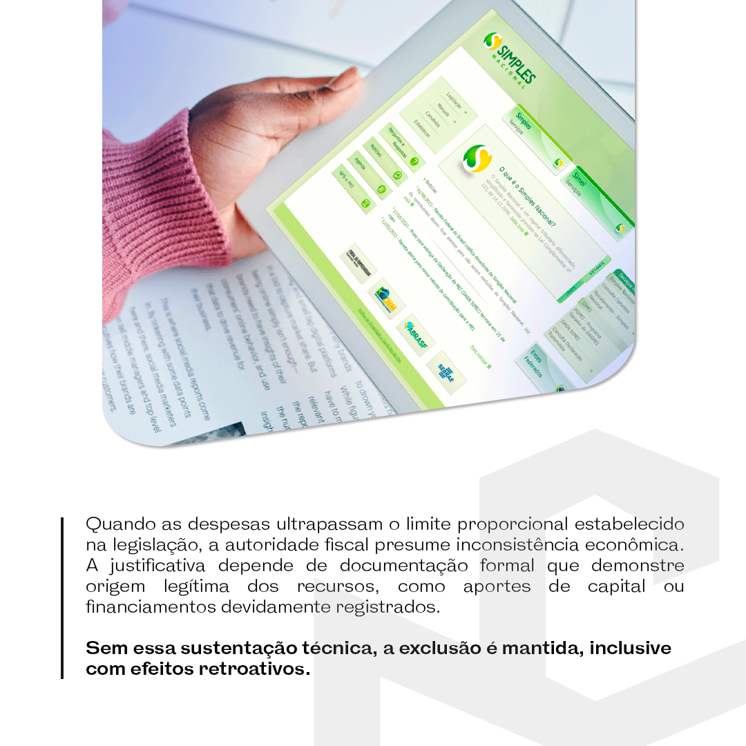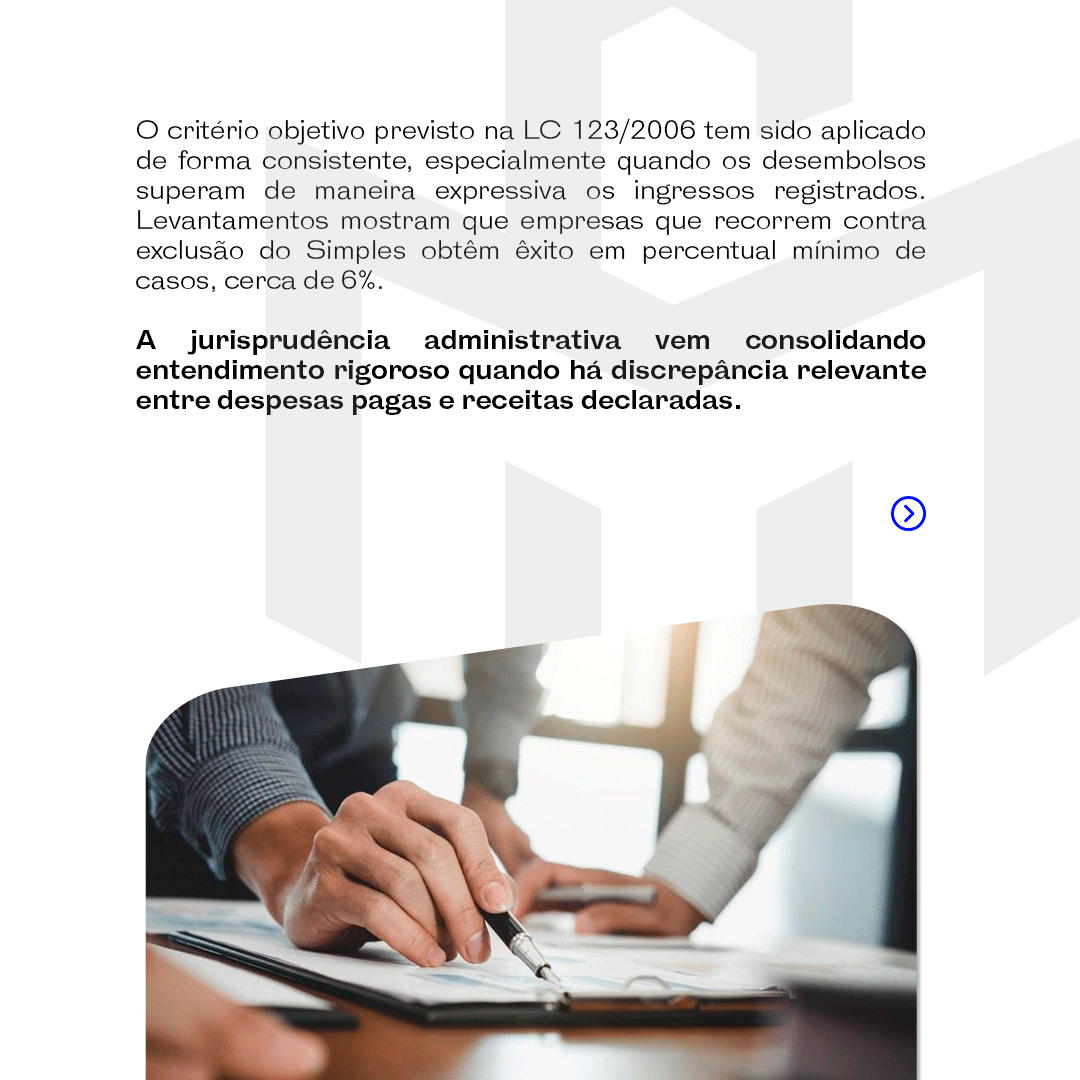 A manutenção no Simples Nacional depende de compatibilidade entre fluxo financeiro e receitas declaradas. A jurisprudência administrativa tem aplicado de forma objetiva o critério legal quando despesas superam significativamente os ingressos registrados.