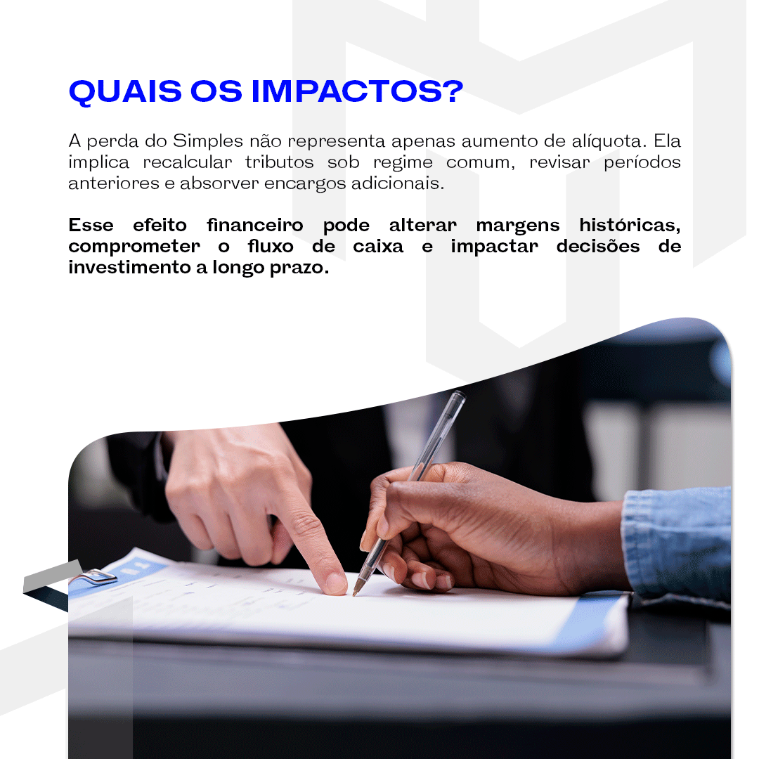 O risco não está apenas na exclusão, mas no efeito retroativo do reenquadramento. A mudança de regime pode gerar passivos expressivos, recalcular tributos como IRPJ, CSLL e contribuições previdenciárias, além de afetar a distribuição de resultados aos sócios.