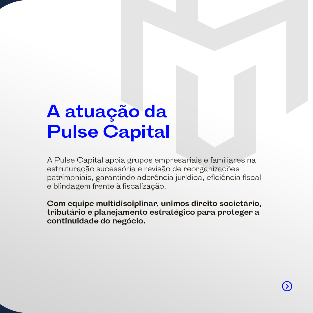 A Pulse Capital ajuda famílias empresárias a estruturar holdings, definir mecanismos sucessórios rastreáveis e revisar modelos de reorganização, sempre em nome da governança de longo prazo.