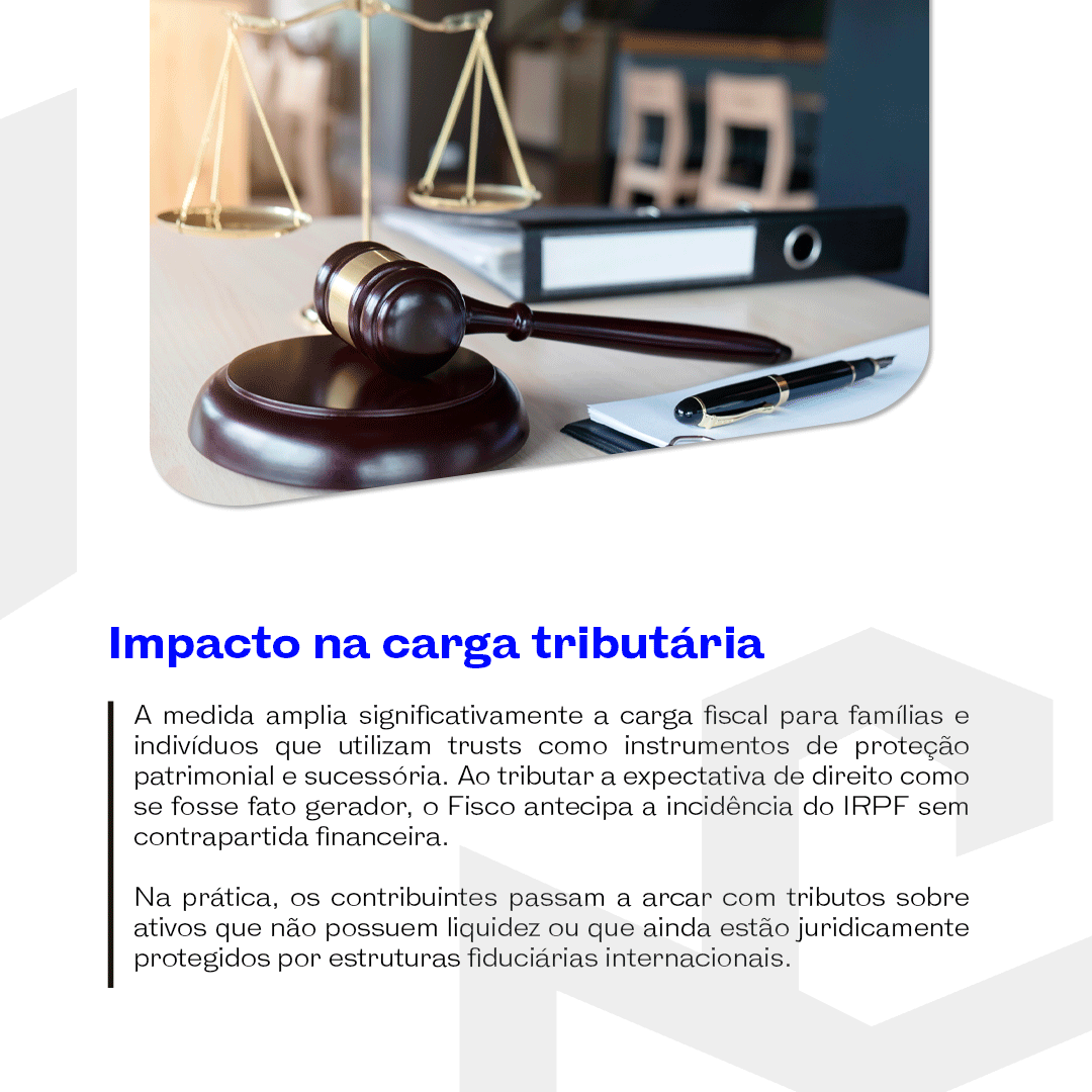 A obrigatoriedade de tributar rendimentos ainda não disponibilizados, sem posse, controle ou acesso efetivo, altera a lógica tradicional de incidência tributária. Essa abordagem amplia significativamente a exposição de famílias que utilizam estruturas fiduciárias legítimas como ferramentas de planejamento tributário, patrimonial e sucessório. Além disso, impõe obrigações fiscais antecipadas sem respaldo legal específico ou jurisprudência pacificada, o que acentua o grau de incerteza jurídica.