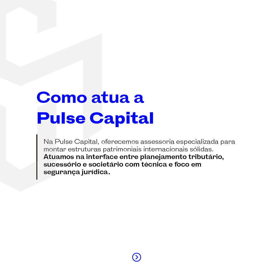 Na Pulse Capital, atuamos na reestruturação de ativos internacionais com visão integrada entre as frentes fiscal, jurídica e societária. Oferecemos soluções customizadas para famílias e grupos empresariais que buscam preservar e proteger seu patrimônio em um ambiente normativo em constante transformação.